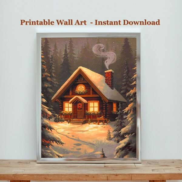 Christmas Cabin Wall Art Vintage Winter Forest Print Digital Download,5 Size Ratios,Holiday Home Decor,Christmas Gift