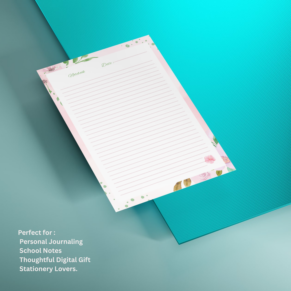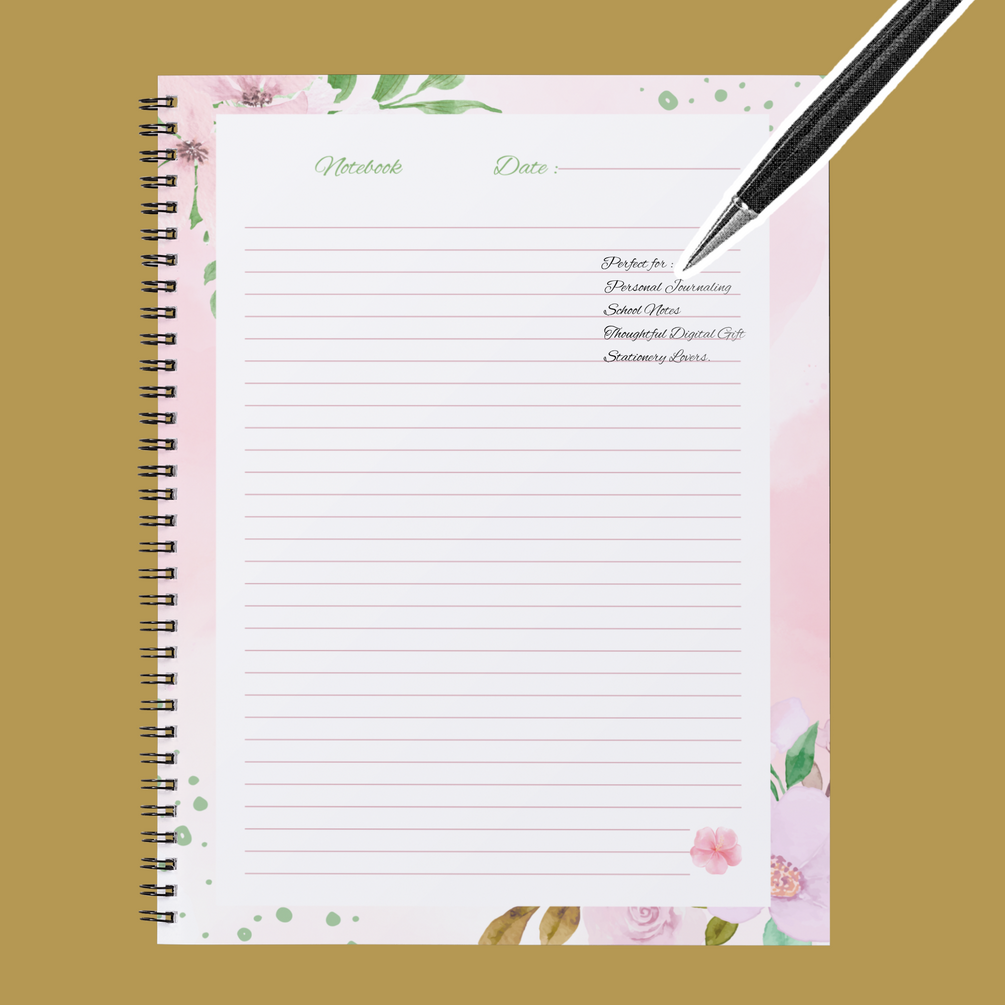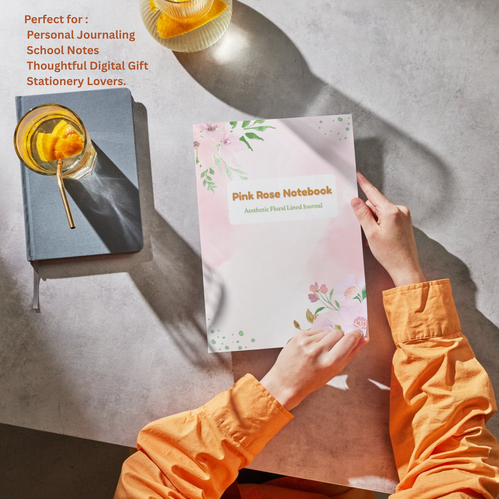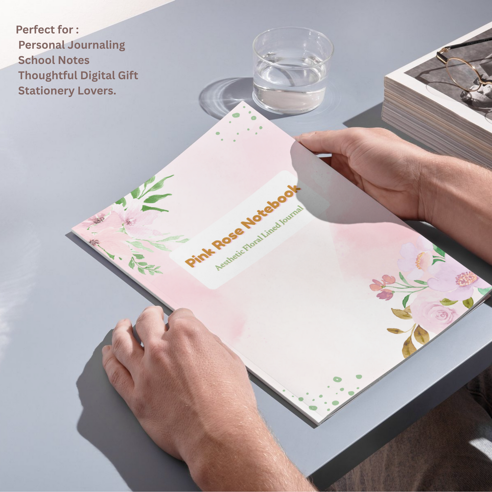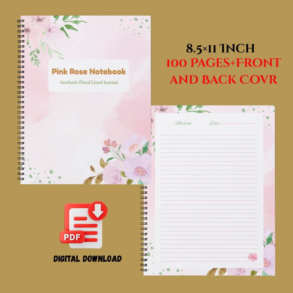 Pink Rose Lined Journal (8.5×11”) | Floral Aesthetic Writing Notebook | Printable PDF
