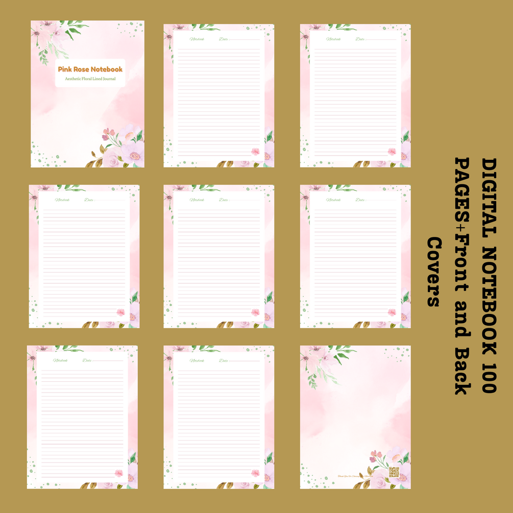 Each page features soft gray lines, balanced spacing, and a gentle pink rose design that brings elegance to every word you write.